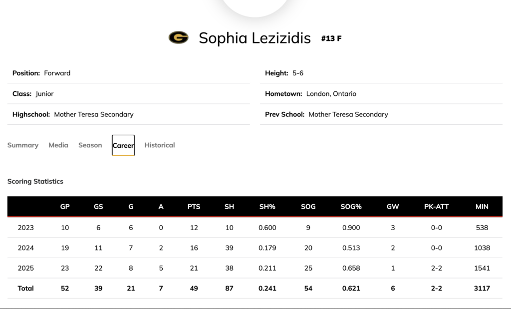 Beyond the NCAA, I have consistently produced at the League1 Ontario level. In my 2025 debut season with Railway City FC, I scored 14 goals in 11 matches, immediately establishing myself as one of the league’s top offensive threats. Previously, I represented BVB Waterloo and Whitecaps London, where I recorded a 19-goal season and earned multiple Team of the Week and Team of the Month honors. Earlier in my career, I was invited to both the National Development Centre and Ontario Provincial Screening, and I posted a standout 24-goal U17 season with Whitecaps London.